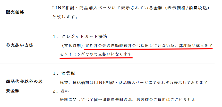 特商法ページには「定期課金等の自動継続課金は採用していない」と明記されています(2026年4月時点)。次回の購入をしなければ自動的に止まるため、「解約手続きを忘れて課金が続いた」というトラブルは起きません。